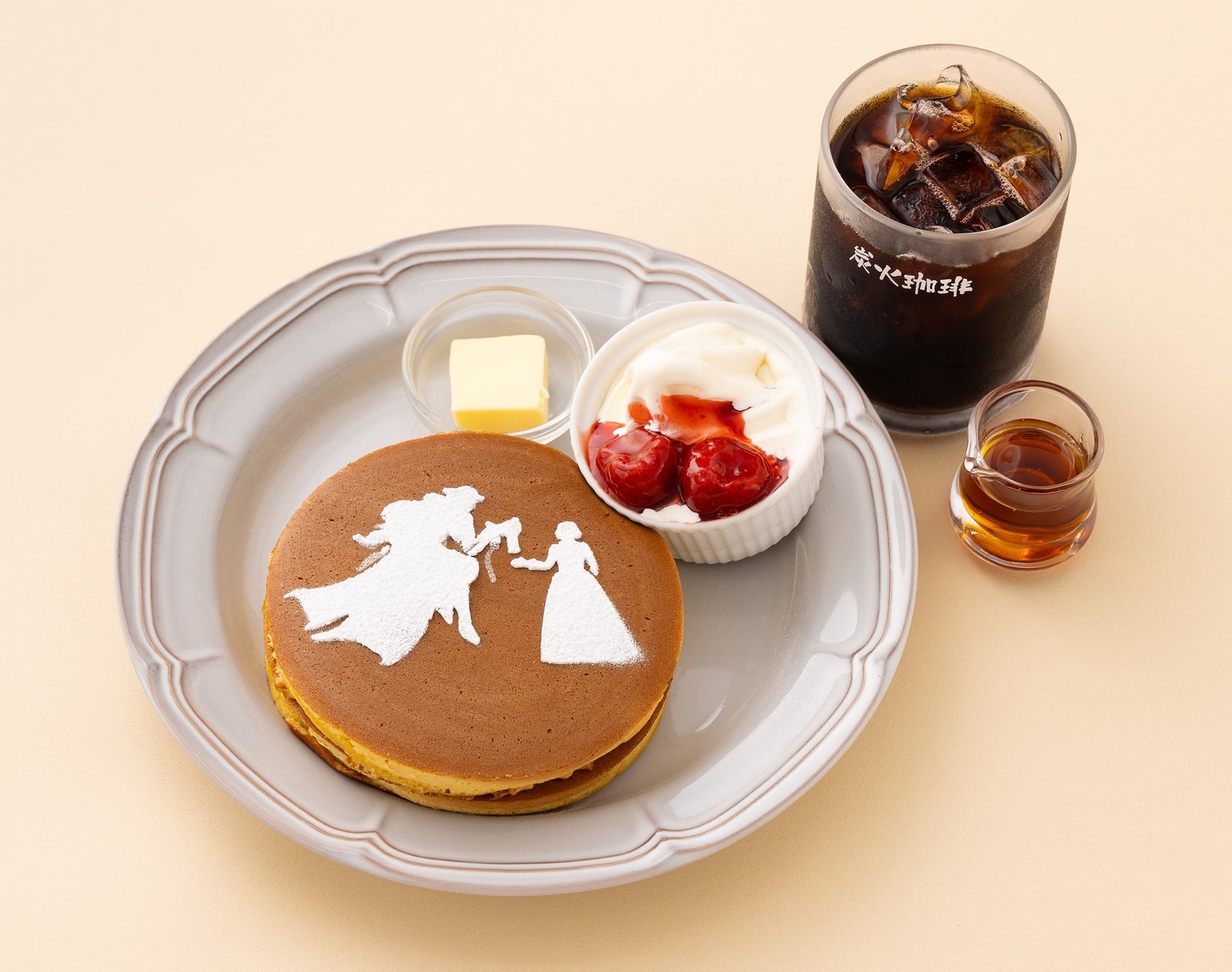 『ゴースト&レディ』特別コラボとして、アトレ竹芝の珈琲館でしか味わうことができないホットケーキと、ソフトクリームに苺ソースを添えた特別なセットです。炭火アイスコーヒーと一緒にどうぞ。