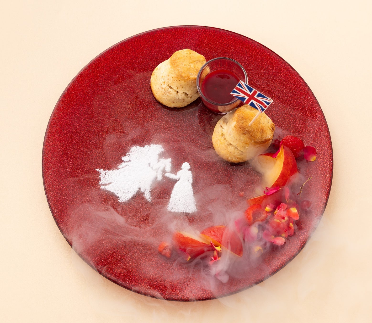 舞台であるイギリス発祥の「スコーン」の周りに華やかな香りのフルーツを添えたラグジュアリーなデザートです。