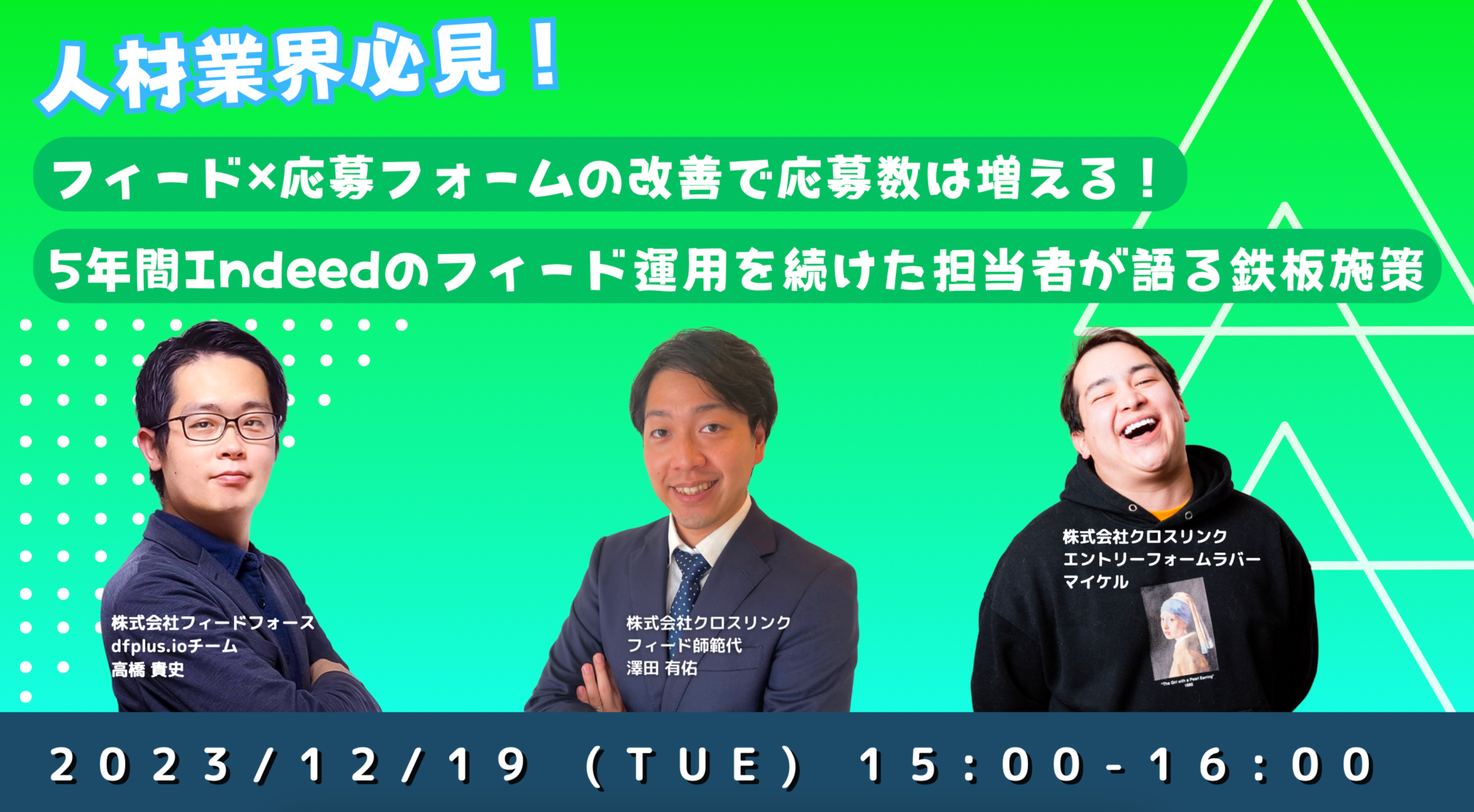 【12/19(火) 15:00~ 開催】人材業界必見!「フィード × 応募フォームの改善で応募数は増える!5 年間 Indeed のフィード運用を続けた担当者が語る鉄板施策」セミナー
