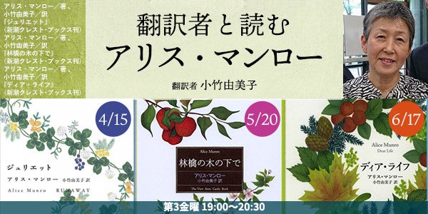 4月15日(金)19時より、「翻訳者と読むアリス・マンロー」第2期を開講します。2013年にノーベル文学賞を受賞したアリス・マンロー。その訳者として知られる小竹由美子さんを講師に迎え、参加者の皆さんと一緒にマンロー作品を読んでいくオンライン講座です。今期は「家出」(『ジュリエット』より)、「チケット」(『林檎の木の下で』より)、「日本に届く」(『ディア・ライフ』より)を取り上げます。全国どこからでも参加でき、見逃し配信もついています。