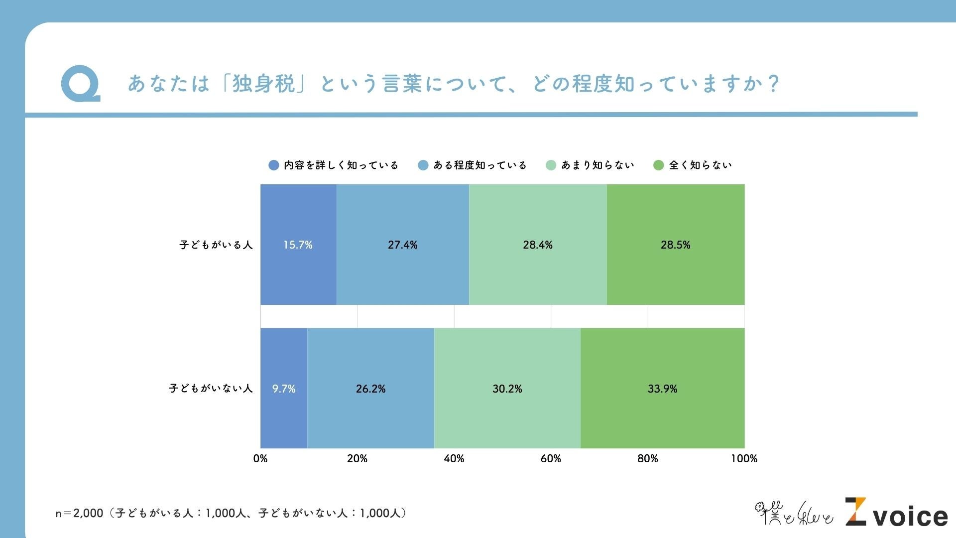 まず「独身税」という言葉の認知度について、「子どもがいる人/子どもがいない人」に分けてヒアリングを行いました。