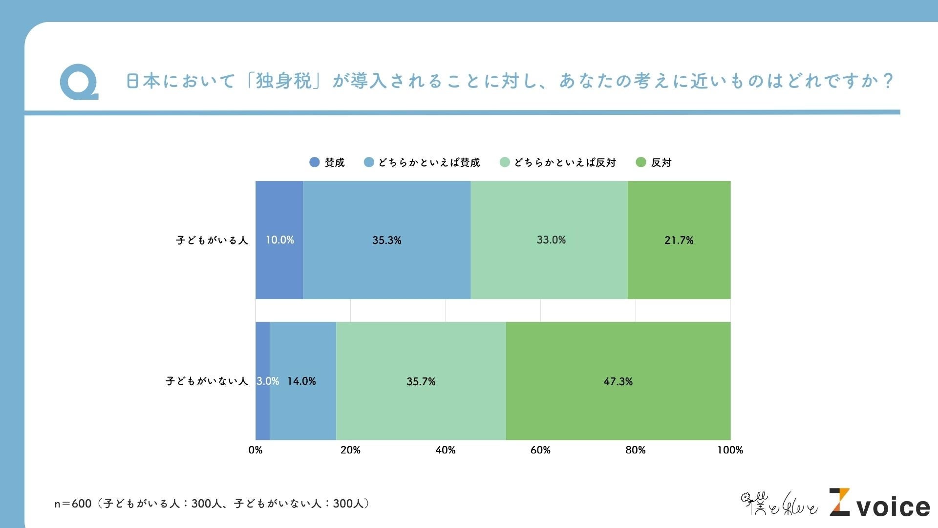 次に、「子どもがいる人/子どもがいない人」それぞれ300人に対し、「独身税」導入の賛否についてさらに詳しく聞きました。