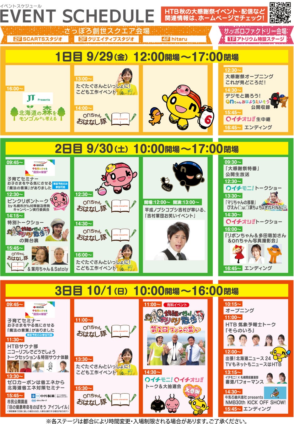 そして30日(土)の9時30分からは2時間10分にわたり、「HTB秋の大感謝祭 イチモニ・イチオシSPありがとonで爽快レボリューション」と題して特別番組を放送。2会場のみどころをたっぷり紹介します。見てから会場に来るのもよし、会場で生放送を見てもよし、来ても見ても楽しいイベントをぜひお楽しみ下さい!