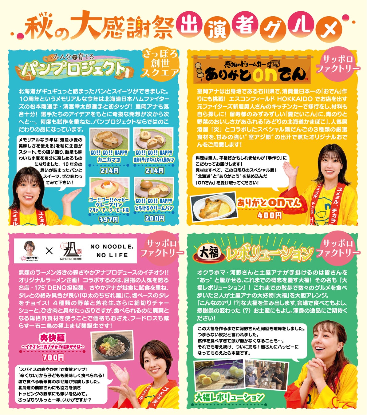 サッポロファクトリー会場では、室岡アナによる「感謝のドリームカー ありがとonでん」、土屋アナとオクラホマ河野さんのしあわせ散歩コンビによる「大福レボリューション」、森さやかアナと175°DENO担々麺による「爽快麺~イチオシ!!森さやかの塩まぜそば~」など、番組のコラボグルメ企画を堪能出来ます。