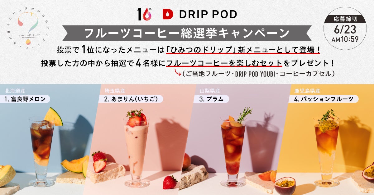 6月18日(水)より、ドリップポッドの公式Xアカウント(@UCC_drippod)で16種類目のフルーツコーヒーメニューを決める「フルーツコーヒー総選挙」を開催します。SNS投票で1位に選ばれたフルーツコーヒーは7月25日(金)より「ひみつのドリップ」新メニューとして提供予定です。また、投票してくださった方の中から抽選で4名の方に自宅でフルーツコーヒーが楽しめるセットをお送りします。