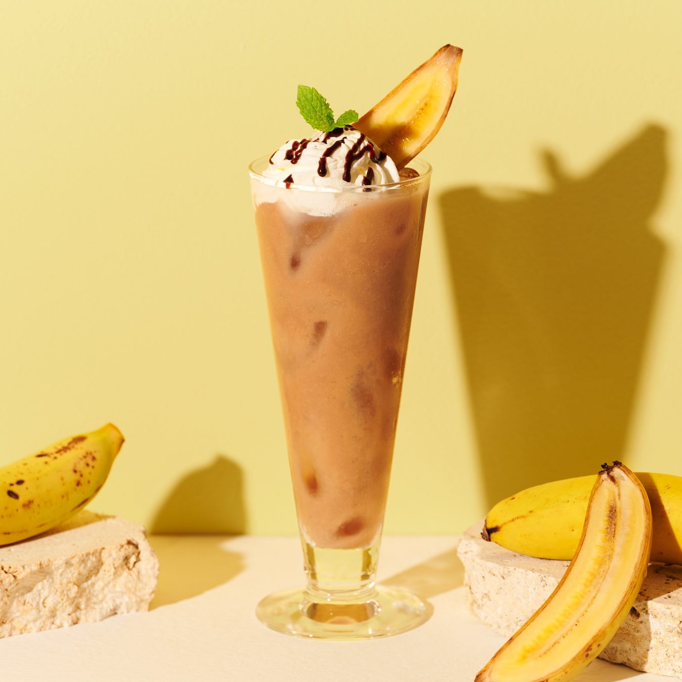 コーヒーのもつ苦味やスモーキーな風味が、バナナやミルクの濃厚な甘さをしっかりと支え、調和した一杯。昨年一番人気だったフルーツコーヒーに、宮崎の肥沃な大地で育った無農薬栽培のバナナを使用しました。バナナは丸ごと皮まで食べることができます。