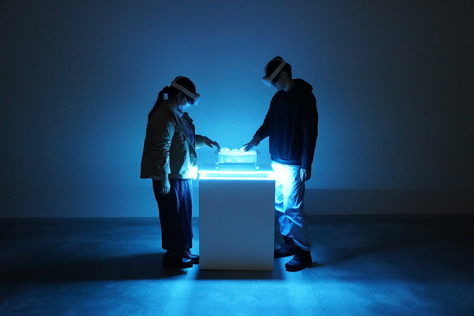鑑賞者がヘッドマウントディスプレイを装着し、アクリル板で構成された表面をなぞるように触れると、水面が空間に広がるように変化し、視覚や聴覚を通じて、より深い感覚的なつながりが生まれます。さらに、本作品の特徴として、複数の鑑賞者が同じMR空間内で体験を共有できる点も挙げられます。