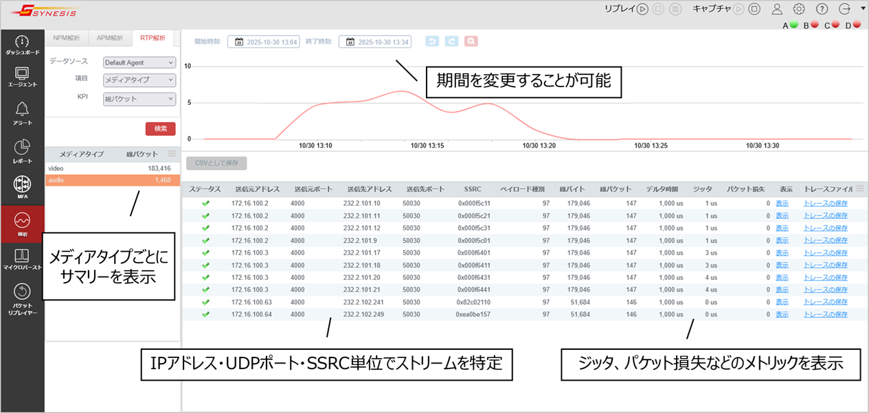 東陽テクニカ製「SYNESIS」は、ネットワーク上の400Gbps(毎秒400ギガビット)のデータを取りこぼしなくキャプチャできる高性能パケットキャプチャ装置です。このたび、音声や動画の伝送に用いられるプロトコル「RTP(Realtime Transport Protocol)」におけるジッタ(パケットの到着時間のばらつき)やパケットロスを、送信元と宛先のペア(ストリーム)単位で測定する機能を実装しました。この機能により、従来は目視判断に頼っていた映像・音声品質をリアルタイムで定量的に評価でき、障害の早期検知と原因特定が迅速に行えます。また、長期間キャプチャしたデータを活用して、障害の再現検証を行うことで、障害対応の時間短縮やコスト削減に寄与します。
