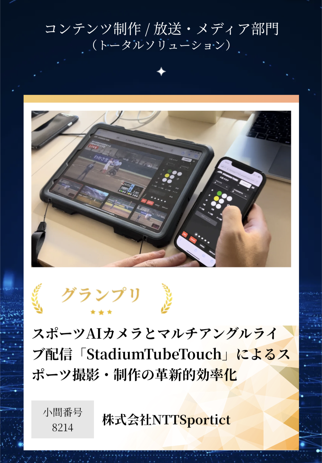 選考の結果、NTTSportictが提供している新サービス「STADIUM TUBE Touch」(タブレット端末を使った次世代型ライブ配信システム)がグランプリを受賞し表彰されましたのでお知らせいたします。