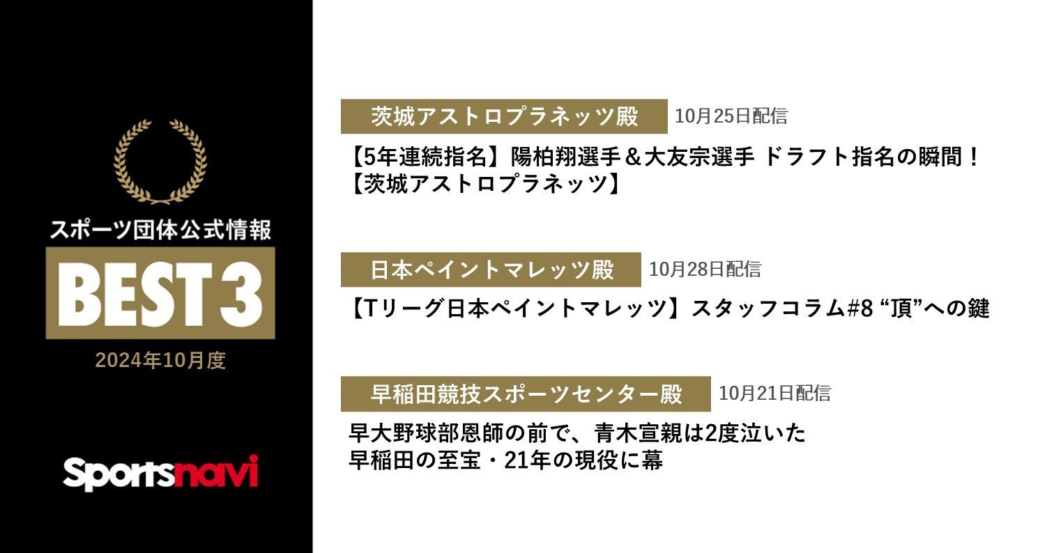 スポーツナビでは毎月、公式情報記事・動画配信において最も印象的だった記事・動画3つを選定し、「スポーツ団体公式記事・動画 月間ベスト3」と称して表彰させていただいております。