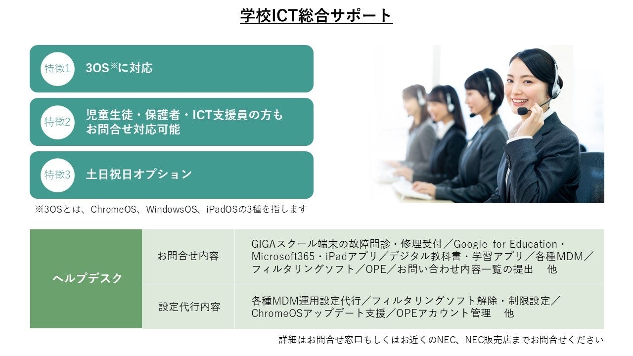 本調査の結果から、現場ではICTを活用した授業の前に、操作方法の習熟やトラブル対応に追われていると言えます。このような中で、NECはヘルプデスクサービス「学校ICT総合サポート」を提供しています。今回の調査結果を踏まえ、学校現場がICTを用いたより良い授業・学習に専念できるよう、ヘルプデスクにて課題解決を支援していきます。