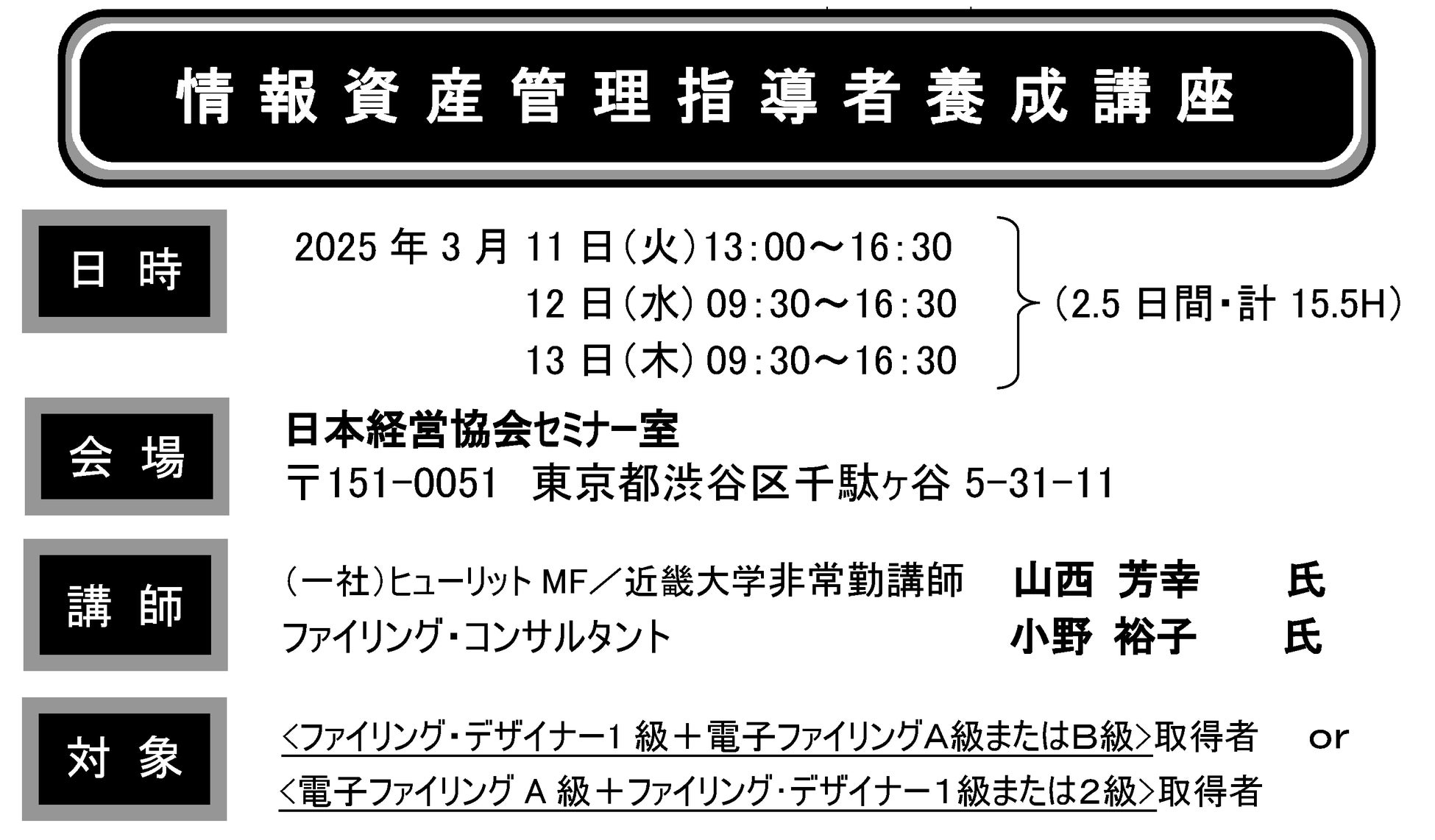 ※本講座は「ファイリングデザイナー検定」および「電子ファイリング検定」の有資格者を対象としております。