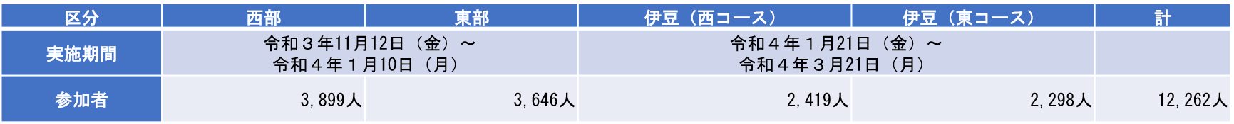 ・スタンプラリーの参加者(計12,262人)のうち、県内在住者が5,732人(46.7%)、県外在住者が6,530人(53.3%)の構成となり、スタンプラリー参加者の消費単価(1人当たり消費支出額)は、県内在住者が21,822円、県外在住者が35,401円であった。