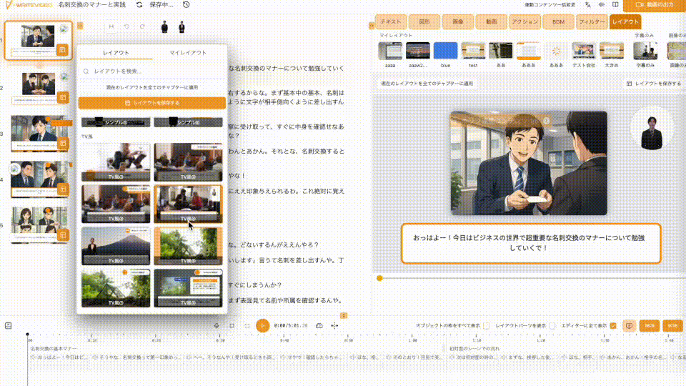 キャラクターの人数や配置、ナレーションのトーン、読み上げ速度、説明内容の詳しさ、アニメーションの動き方といった要素を、編集画面内でまとめて設定できるようになりました。