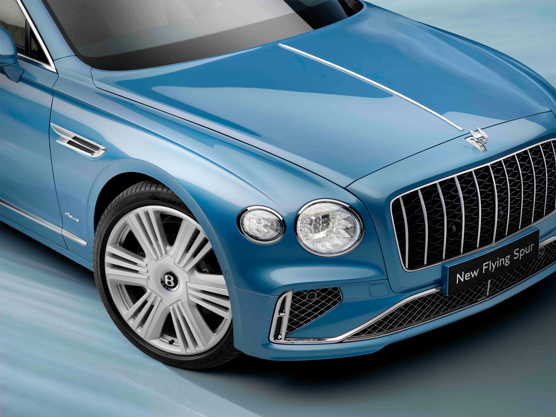 コンチネンタルGTアズールと同様に、新型フライングスパー アズールは、光沢ブラック仕上げのマトリックスグリルにクロームのサラウンドと11本の縦型ヴェインを組み合わせた、印象的なフロントフェイスを採用しています。その他の特徴としては、Azureフェンダーバッジ、クローム仕上げの下部グリル、ブライトクロームの外装アクセント、そしてシルバーと明るく機械加工された金属による新デザインの22インチアズールホイールが挙げられます。これらアズール特有の要素は、クローム仕上げ仕様とダークグロスブラックライン仕様の2つから選択可能です。