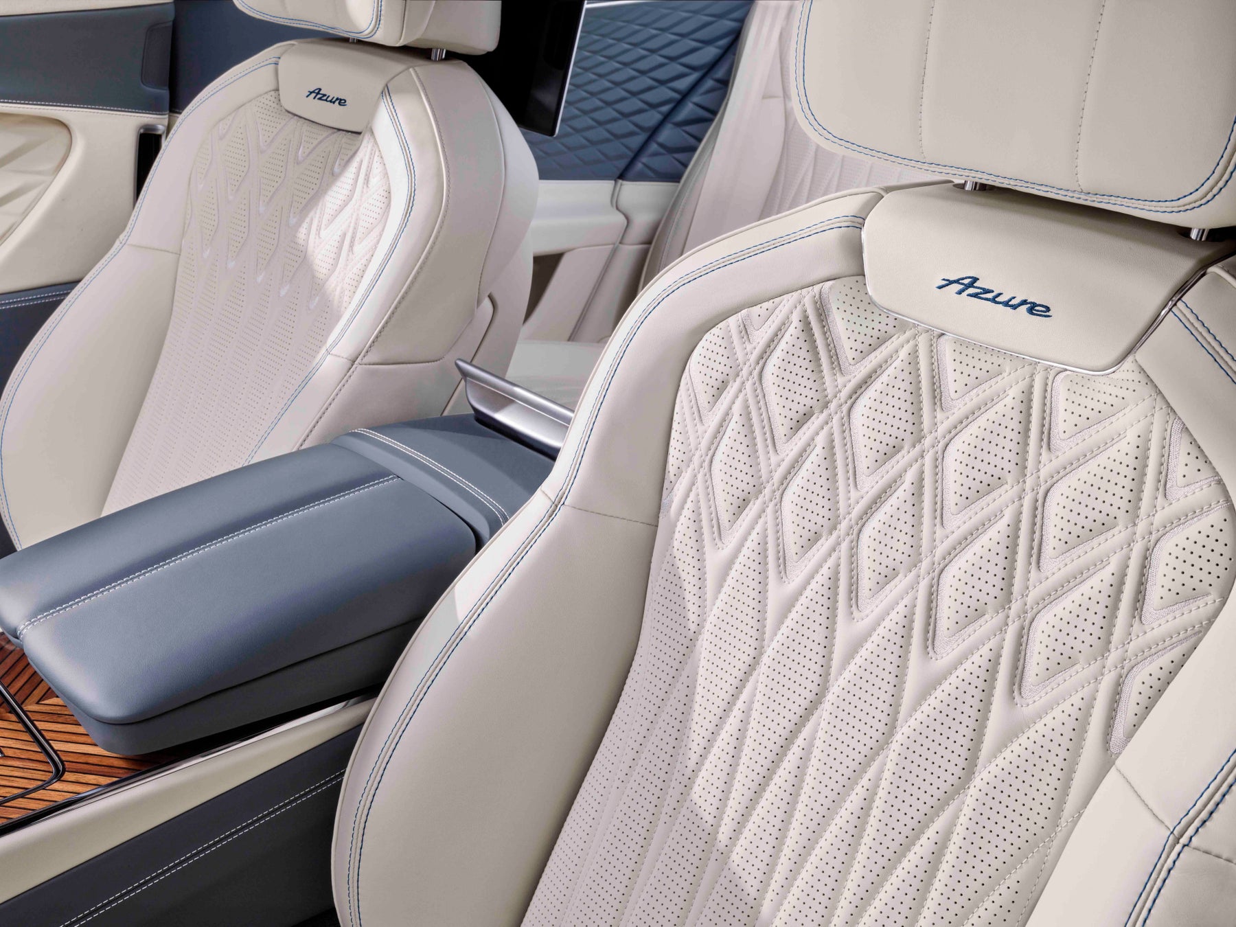 エレガントなデザイン、豪華な装備、そしてウェルビーイングへの徹底したこだわり。それらすべてが、「アズール」モデルの魅力を体現しています。まず目に入るのは、光沢ブラック仕上げのマトリックスグリルと、明るいクロームのサラウンド、そして縦型ヴェイン(フィン)の組み合わせがもたらす、洗練されたフロントフェイス。さらにその下には、光沢ブラックのフロントスプリッターが、下部インテークにあしらわれた明るいグリルと美しいコントラストを描きます。足元には、新デザインの22インチアズールホイール(シルバー&明るく機械加工された仕上げ)を採用。フロントフェンダーのアズールバッジとともに、外装全体に気品を添えています。インテリアでは、シートとドアインナーに新たな3Dハーモニーダイヤモンドキルティングを施し、シートヘッドレストにはアズール専用の刺繍をあしらいました。細部にまでこだわり抜かれた仕立てが、乗る人すべてに深い満足をもたらします。