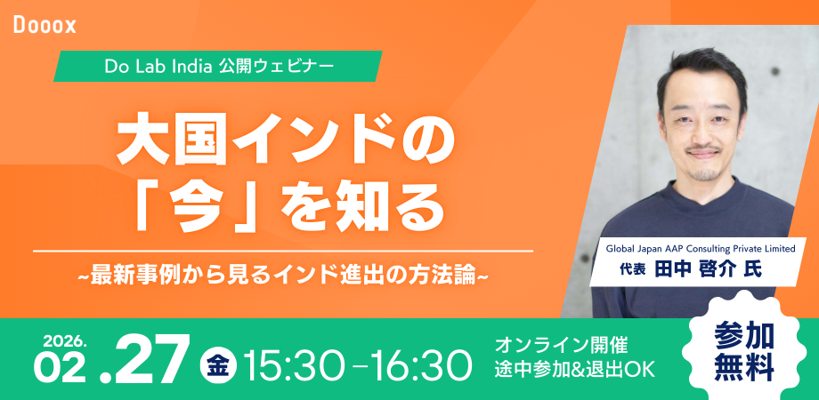 “行動で世の中を変えていく“を理念に掲げる株式会社Dooox(東京都品川区、代表取締役 久保寺亮介/以下「当社」)が運営するインド進出支援プラットフォーム「Do Lab India」は、この度、日本企業のための公開ウェビナー「大国インドの『今』を知る - 最新事例から見るインド進出の方法論 -」を2026年2月27日(金)にオンラインで開催いたします。