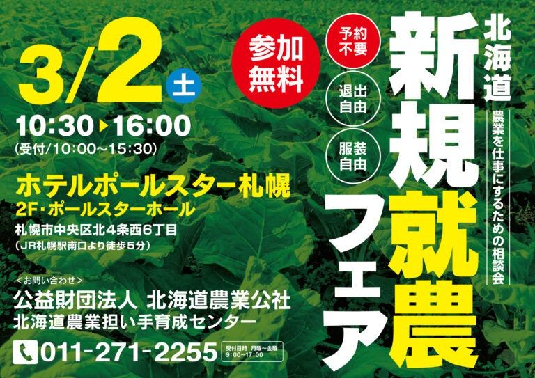 就農希望者と北海道の農業関係者とつなぐ就農イベント、3月2日(土)にホテルポールスター札幌で開催