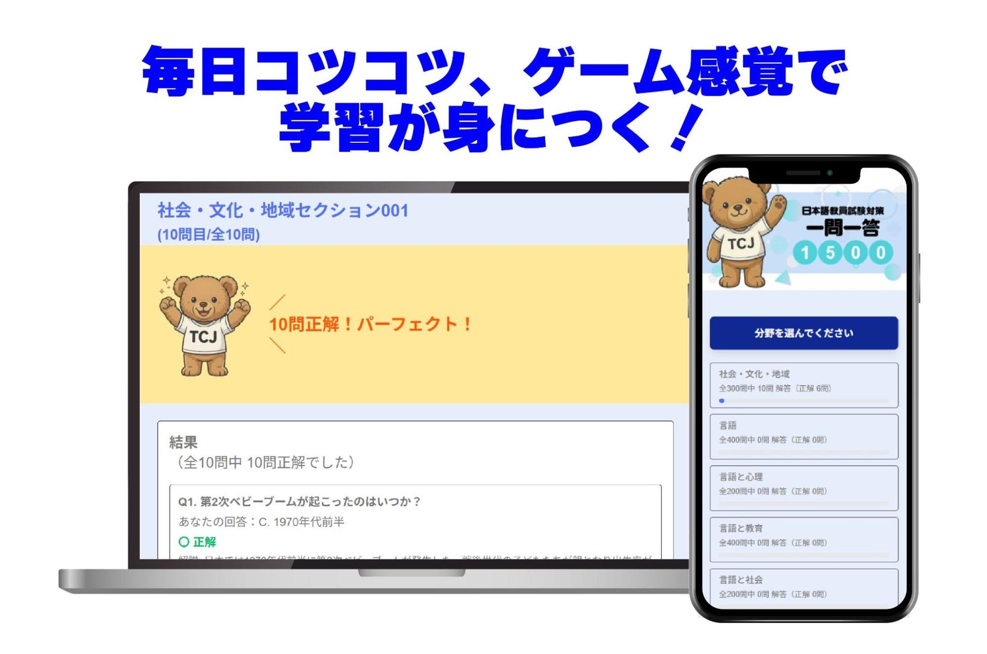 そのため、「学習時間の確保が難しい」「覚えた知識が定着しているか不安」「直前期に効率よく総復習したい」といった課題を抱える受験者が少なくありません。こうした背景を受け、TCJグローバルでは、短時間でも反復学習が可能で、理解度を即座に確認できるクイズ形式に着目し、日本語教員試験対策に特化した一問一答型Webアプリの開発に至りました。