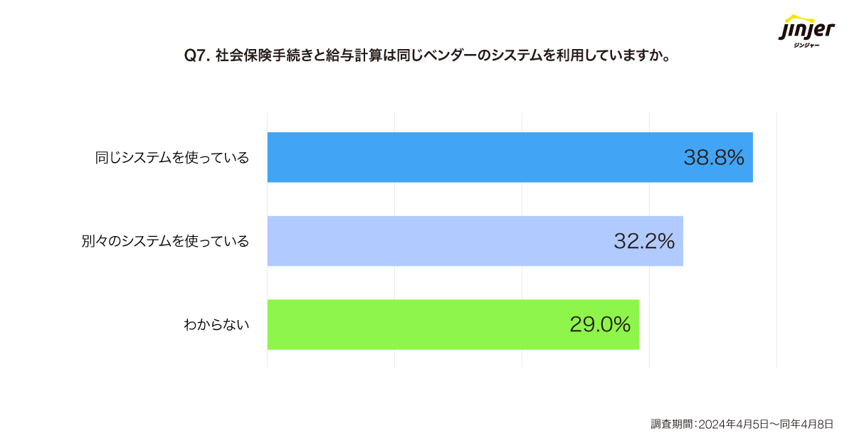 「社会保険手続きと給与計算を同じベンダーのシステムで利用しているか」について質問したところ、「同じシステムを使っている」と答えた企業は38.8%。「別々のシステムを使っている」と答えた企業は32.2%でした。
