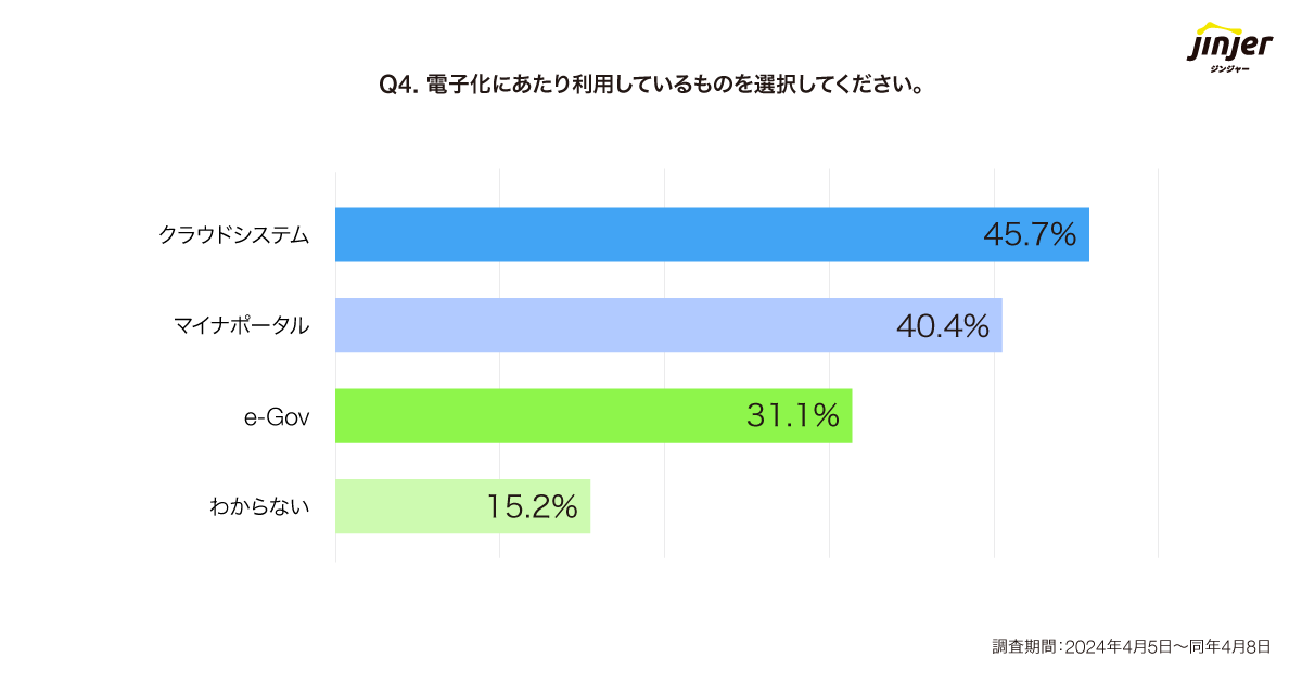 電子化にあたって利用しているサービスを聞いたところ、最も多かった意見は「クラウドシステム(45.7%)」だった。次いで「マイナポータル(40.4%)」、「e-Gov(31.1%)」という結果でした。