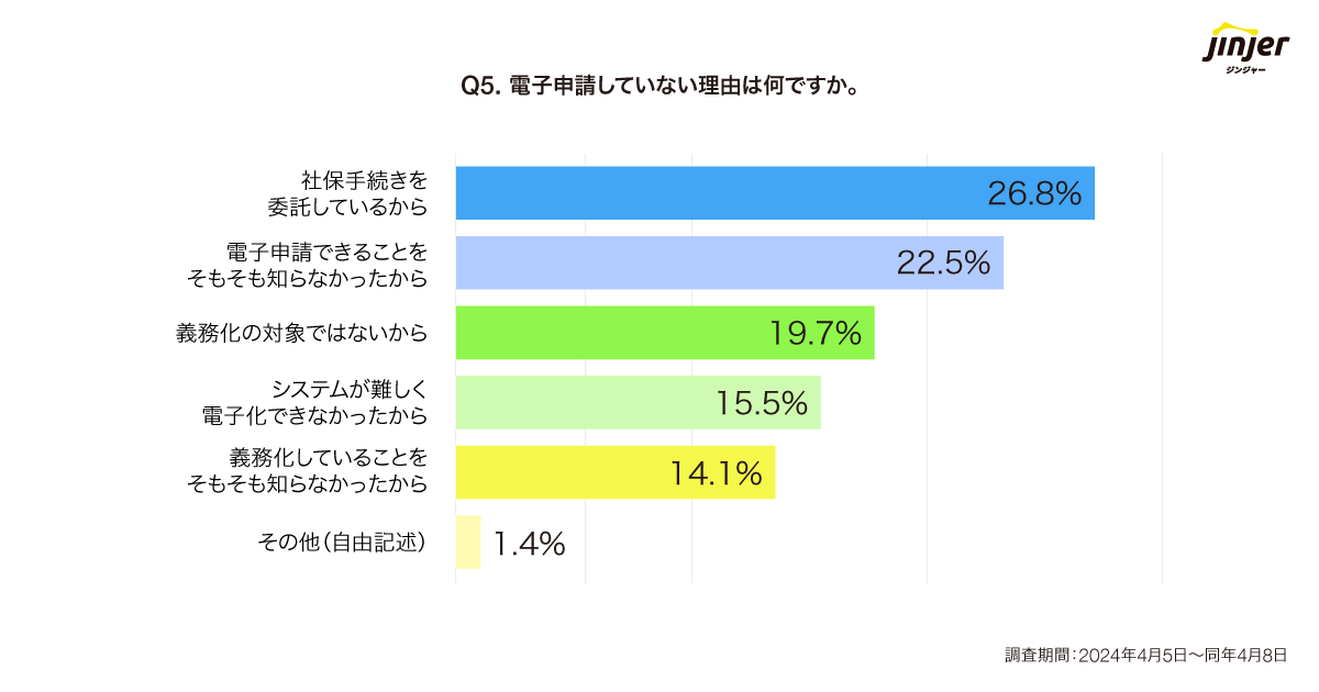 電子申請を現状で行っていない理由を聞いたところ、最も多くあった意見は「社保手続きを委託しているから(26.8%)」。次いで「電子申請できることをそもそも知らなかったから(22.5%)」、「義務化の対象ではないから(19.7%)」、「システムが難しく電子化できなかったから(15.5%)」という結果でした。
