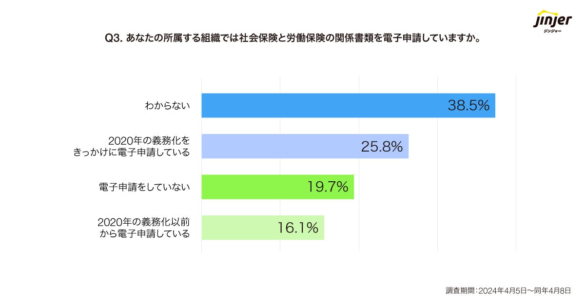 「社保手続きの電子申請義務化」以降、電子申請している企業は全体の40%弱。また、全体50%以上が「義務化の詳細を把握できていない」
