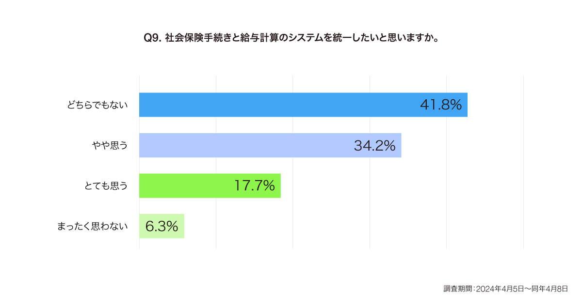 また「別々のシステムを利用し、不便さを感じている企業」へ、「社会保険手続きと給与計算のシステムを統一したいか」と質問したところ、「やや思う(34.2%)」、「とても思う(17.7%)」と答えた企業が合わせて51.9%と、企業の約半数において「システムを統一して利用したい」と考えていることがわかりました。