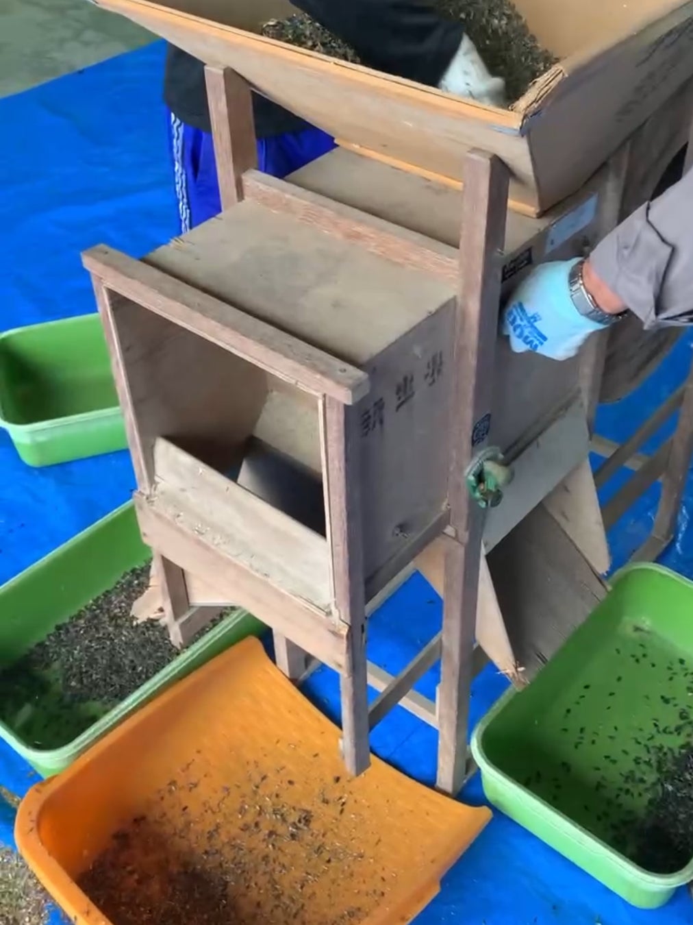 唐箕(とうみ)を使って、実がつまった種を選別します。 -