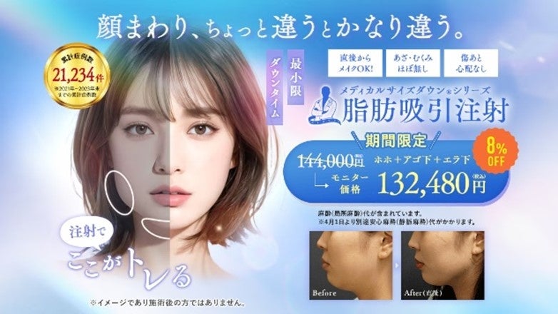 本シリーズのひとつである「小顔用脂肪吸引注射」は、従来、治療範囲を「1エリア=手のひら1枚分」とする基準に基づき、1エリア単位で料金を設定しておりました。しかし、この「1エリア」という基準は医師の判断に委ねられるため、施術範囲の捉え方に差が生じる事がありました。そこで、当院ではあご下・エラ下など部位別に明確な料金体系を導入。これにより、お客さまが事前に費用を把握しやすく、他治療との比較もしやすい仕組みへと改善いたしました。湘南美容クリニックでは今後も、誠実な美容医療の提供を目指し、治療内容はもちろん、価格の透明性にも徹底的にこだわってまいります。