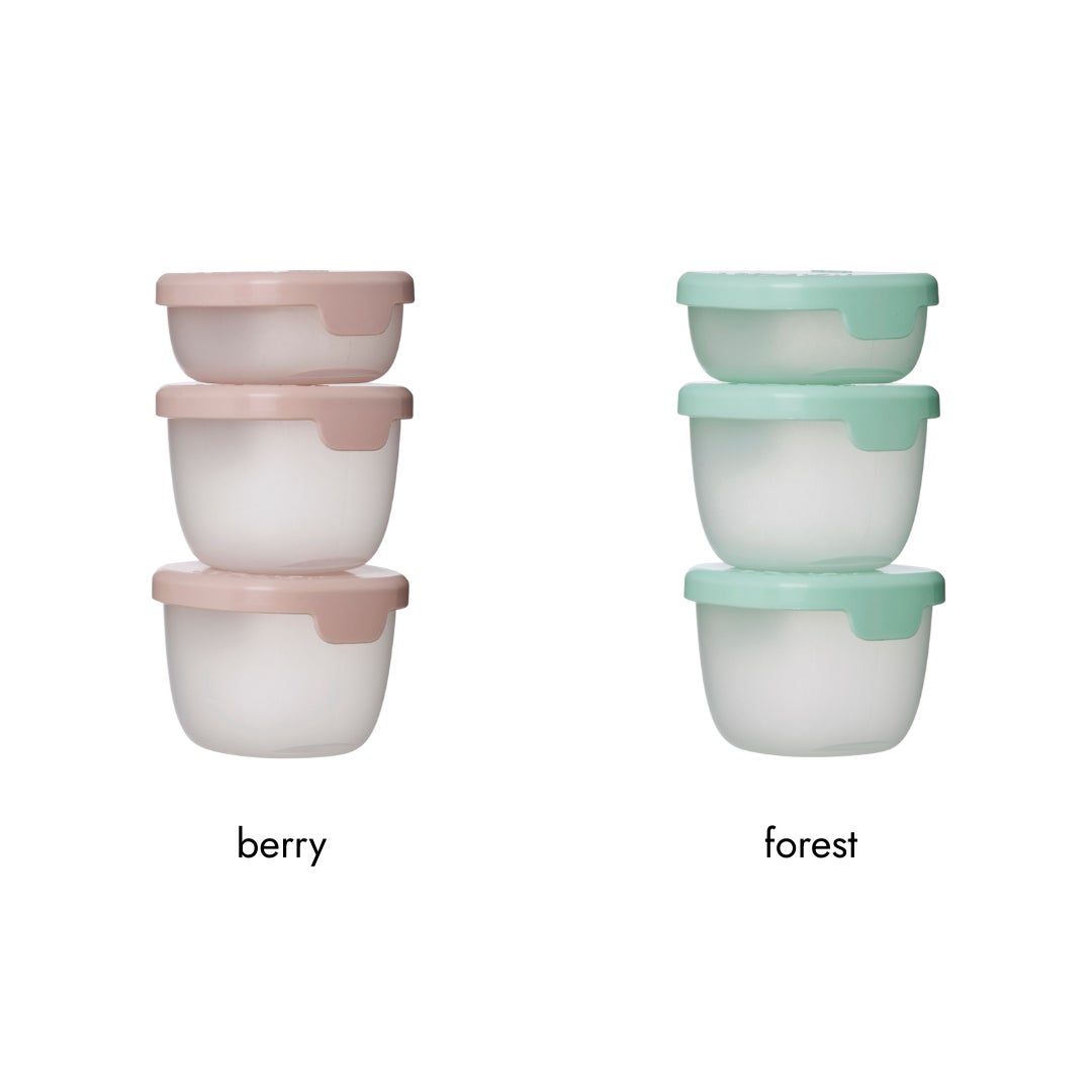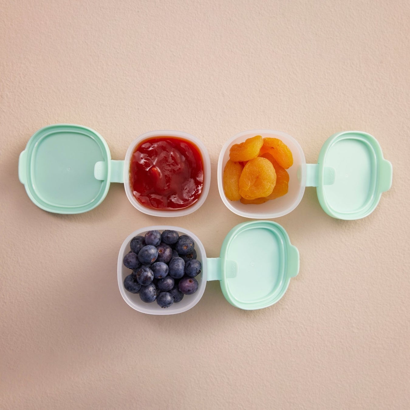 ソースやフルーツ、おやつなどをスマートに持ち運べる小分け容器セット。蓋が容器と一体化した設計で、パーツをなくす心配がありません。120ml×2個、60ml×1個の3個セットで、単品使いはもちろん、「ランチボックス」「ミニランチボックス」「スナックボックス」に入れて組み合わせて使うこともできます。