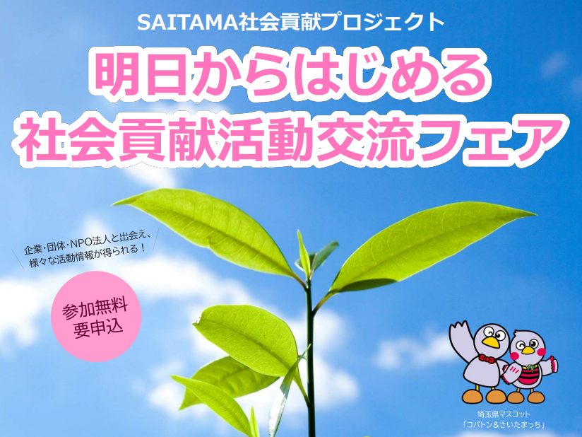 この度、SAITAMA社会貢献プロジェクトの取組で培った知見等をもとに、CSR・社会貢献活動をこれから始めたい企業・団体等に対して、活動を始めるきっかけづくりや活動をステップアップする機会を提供するため、CSR・社会貢献活動に取り組む多様な主体が一堂に会する、「明日からはじめる社会貢献活動フェア」を初めて開催します。
