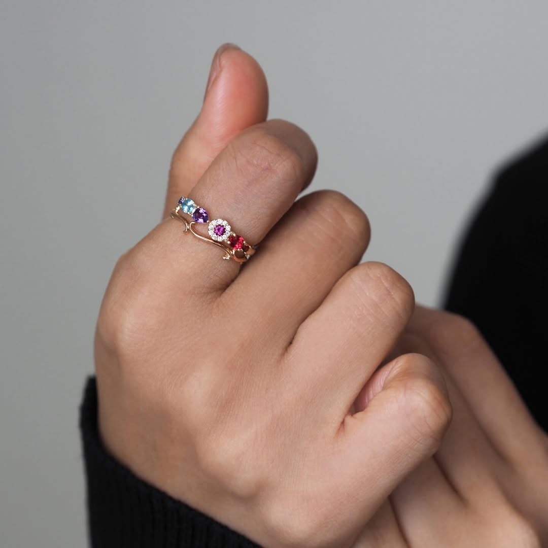 “百の色”を意味する「Cent Couleur(サンクルール)」は、創業当初から愛され続けてきたパーセル ジュエリーを代表するシリーズです。ペアシェイプ、ラウンド、オーバルといった形の異なる宝石が連なり、花冠のように可憐な印象をもたらします。