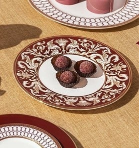 深紅の縁取りには神話上の動物が描かれ、食卓に伝説の物語を紡ぎ出そうとしているかのようです。美しい透光性と堅牢性を誇るファイン ボーン チャイナ製です。
