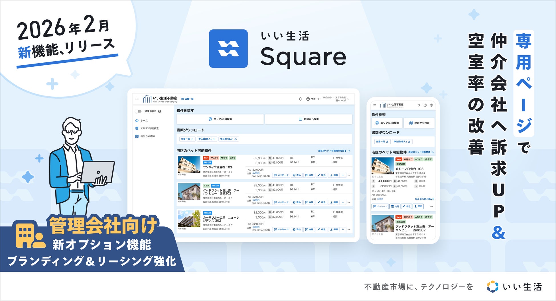 こうした背景を受け、いい生活では「いい生活 Square」のプラットフォームとしての利便性をさらに高め、管理会社がより仲介会社へアプローチできるオプション機能をリリースいたします。