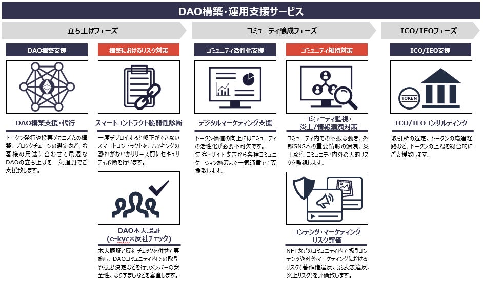 デジタルリスク対策の先駆者として、これまでに培った「デジタルリスク対策にまつわるノウハウ」と、「AIを用いたデータ分析の基盤技術」をもとに、DAO構築の立ち上げフェーズからコミュニティ情勢フェーズ、ICO/IEOフェーズにおける運用面、リスク面のサポートを行い、安心・安全なDAO型コミュニティ実現に貢献していきます。(具体的な提供予定サービスは、下記図を参照)
