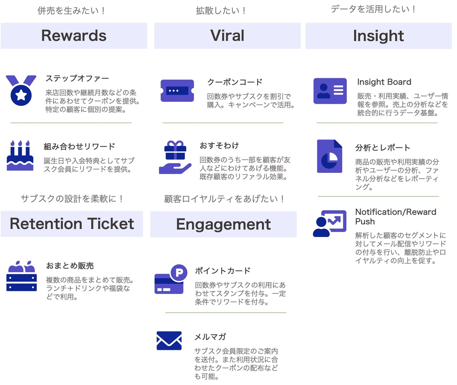 「giftee Loyalty Platform」は、デジタルチケットを活用しブランドの既存顧客のロイヤルティ向上に資する仕組みを提供するソリューションです。飲食・流通・小売・宿泊事業者を対象に、デジタルの回数券・定期券・サブスクリプションプランなど、既存顧客向けに自家需要を喚起する機能を備えており、ブランドのアプリやeギフト販売ページ、その他ブランドのキャンペーンページ等様々なユーザーインターフェイスに組み込むことが可能です。本ソリューションの活用により、特定の顧客行動や属性にあわせてデジタルチケットを活用したOne to Oneマーケティングの施策を展開することができます。顧客はブランドから特別なプランやお得な情報を属性や行動にあわせて受け取ることが可能となるため、既存顧客のロイヤルティを高めファン化を促す施策となります。また、各ブランドが「giftee Loyalty Platform」を介し発行した回数券・定期券・サブスクリプションプランを自家需要商品として個人に販売する専用サイト「Plus Pass」を2020年12月に開設、販売を開始しております。さらに、「giftee Loyalty Platform」の新機能として、回数券を購入したお客様が回数券を1枚単位で家族や友人に贈れる「おすそわけ機能」および、ドリンクとフード等複数かつ異なる商品のチケットをセットにし回数券として販売する「おまとめ販売機能」を2021年9月より提供開始いたしました。