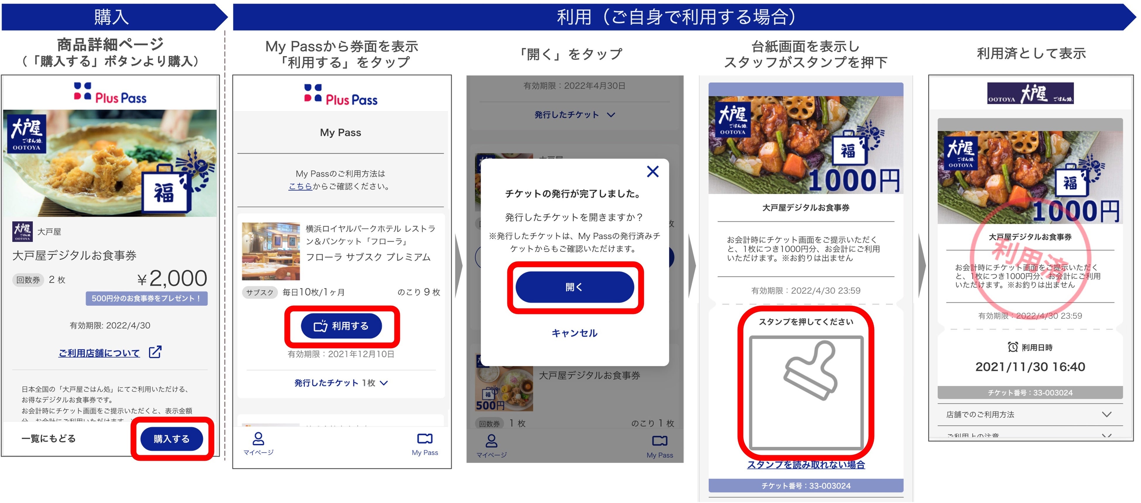 2021年12月27日(月)11:00amから2022年1月31日(月)11:59pmまでの期間で販売するデジタルの回数券「大戸屋デジタルお食事券」は、個人顧客を対象に販売しており、「Plus Pass」からご購入いただけます。今回販売を開始した「大戸屋デジタルお食事券」は、2,000円、4,000円、6,000円(すべて非課税)の3種類です。「おまとめ販売機能」の活用により、各デジタルお食事券の販売額の25%分の「大戸屋デジタルお食事券」がインセンティブとして付与される、大変お得な回数券です。日本国内全国305店(2021年12月末時点)の「大戸屋ごはん処」店舗でのお食事および物販購入時にお使いいただけます。店舗でチケットを利用する際は、来店時にスマートフォンに表示されたチケット画面をスタッフに提示し、スタッフが電子スタンプ「giftee STAMP」(※4)をチケット画面に押印することで決済が完了します。また、本回数券には、「おすそわけ機能」もあわせて導入いただいており、回数券をご購入された方は、SNSやメールなどに”おすそわけ”する回数券のURLをコピーして送信することで、家族や友人に回数券を1枚単位でプレゼントすることができます。