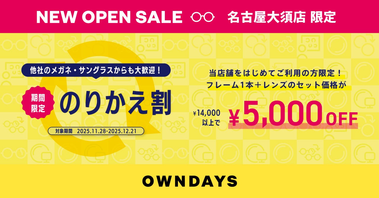 オープンから約1ヶ月間限定で、当店舗(名古屋大須店)を初めてご利用いただくお客様を対象に「のりかえ割」を実施いたします。 期間中、フレーム1本+レンズのセットを税込14,000円以上ご購入いただくと、お会計から5,000円OFFとなります。新しくオープンするこの機会に、ぜひOWNDAYSのメガネをお試しください!