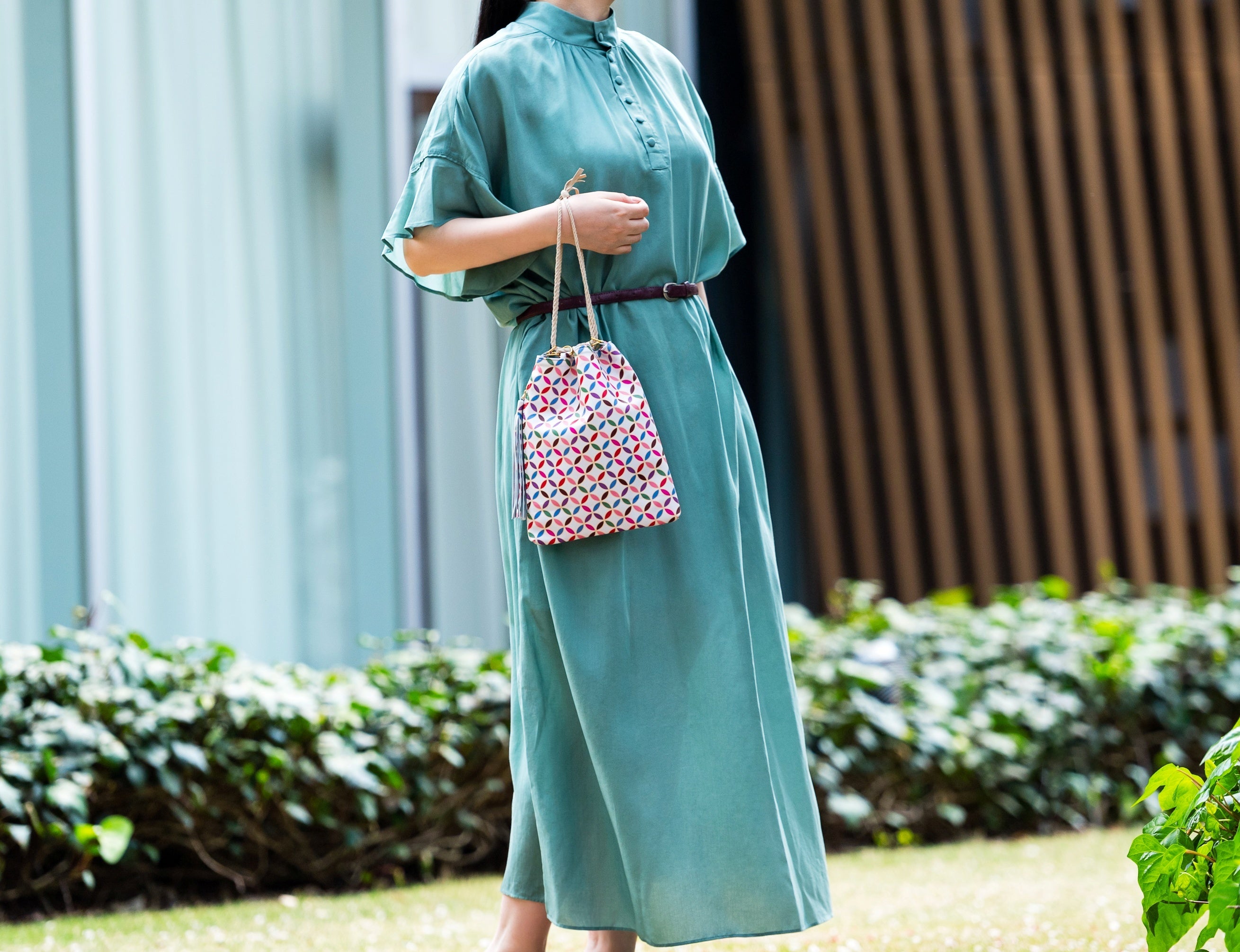 合切袋は、散歩やちょっとした買い物に便利で、手首に“引っかけるだけ”だから楽に持てる人気のアイテム。しかし、和物なため服装のテイストによっては合わせづらい…という課題がありました。