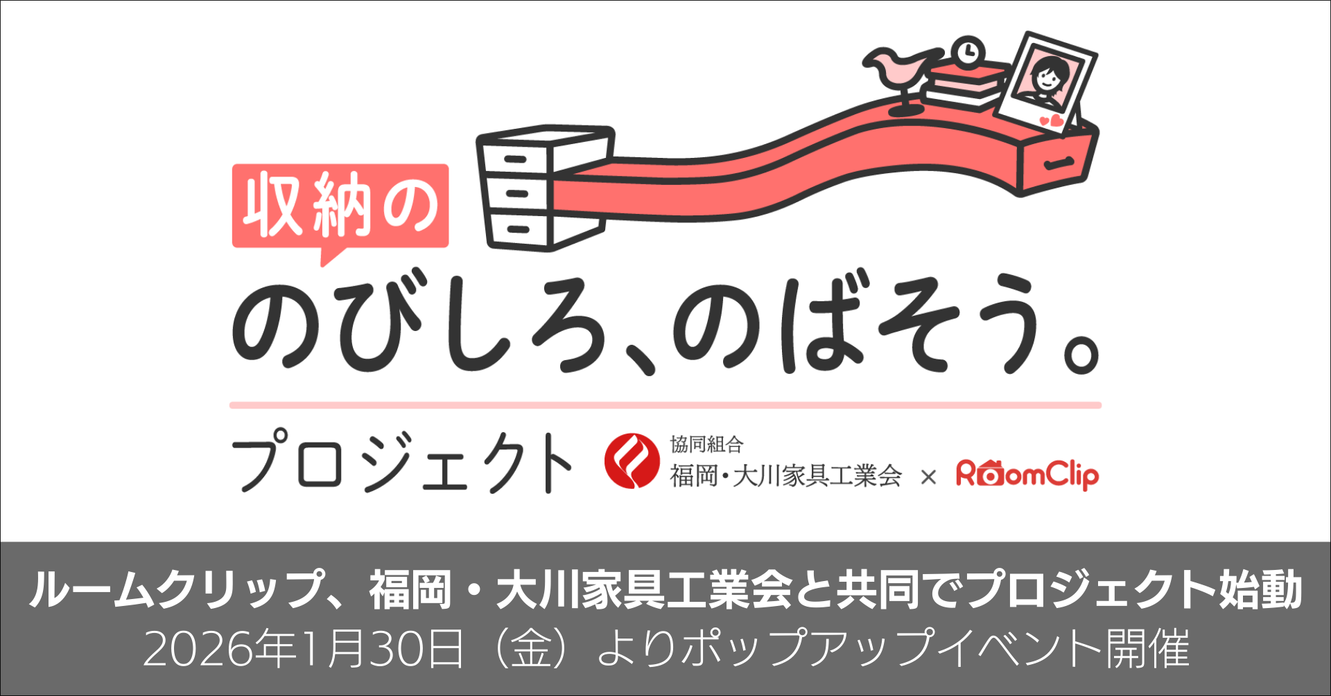 ルームクリップ株式会社(本社:東京都渋谷区、代表取締役CEO:髙重正彦、以下ルームクリップ)は、協同組合 福岡・大川家具工業会(以下、福岡・大川家具工業会)と共同で、現代のライフスタイルに合わせた新しい収納家具を開発・発信する「収納ののびしろ、のばそう。プロジェクト」を始動いたしました 。 本プロジェクトの成果の第一弾として、RoomClipユーザーのリアルな声を反映したプロトタイプ家具を、2026年1月30日(金)より二子玉川(東京都世田谷区)にて開催されるポップアップイベント「THE OKAWA FACTORY」、2月4日(水)より東京ビッグサイトで開催の「第101回東京インターナショナル・ギフト・ショー春2026 / 第19回LIFE×DESIGN」にて展示いたします。