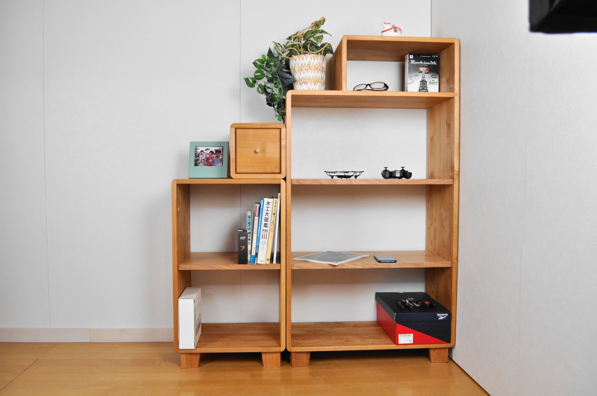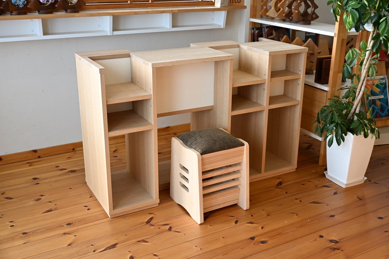 お子さんの成長とともに増えていく、書類や学習用具、作品や思い出の数々。「気がつくと、家の中は学校のものでいっぱいになってしまう」というお悩みに応えました。4サイズのシェルフで収納やデスクスペースが作れる家具。変化に応じて手軽に組換え可能です。角丸のシルエットとオイル塗装で仕上げたナチュラルな表情は、場所を選ばず、暮らしに自然となじみます。