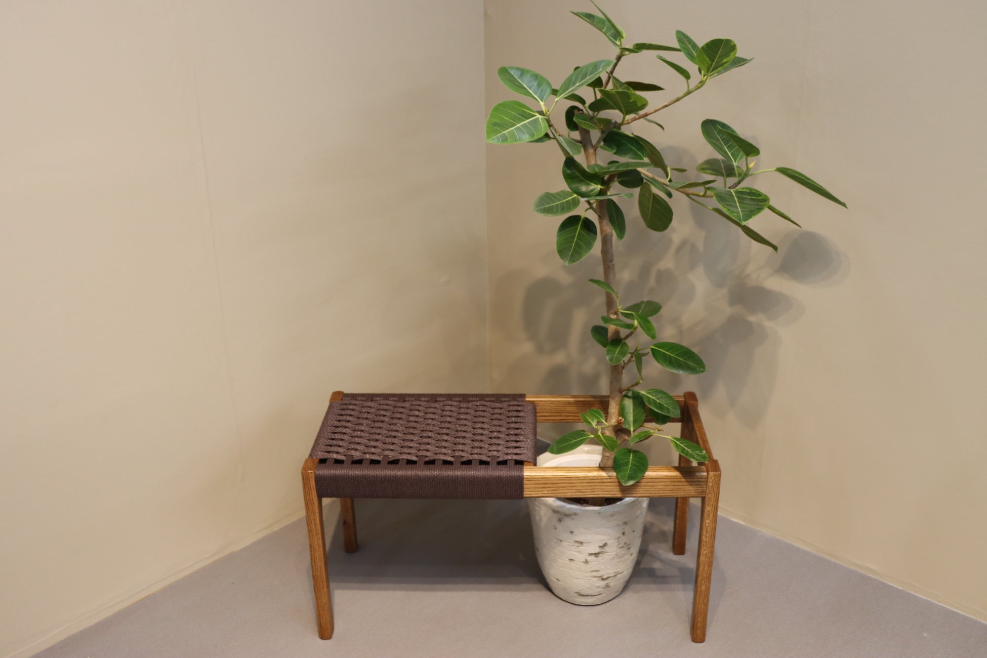 「植物に囲まれて暮らしたい」でも「置き場所がない」という悩みに応えるべく「座る×飾る×植物」をテーマにしたベンチを開発しました。無垢材の柔らかな質感と、手仕事で編み上げたペーパーコードの座面は、植物の緑を鮮やかに引き立てます。また、植物を置く木製トレーは簡単に取り外すことができ、そのままお茶を運ぶトレーとして、あるいはお気に入りの小物を引き立てる飾り台としても活躍します。
