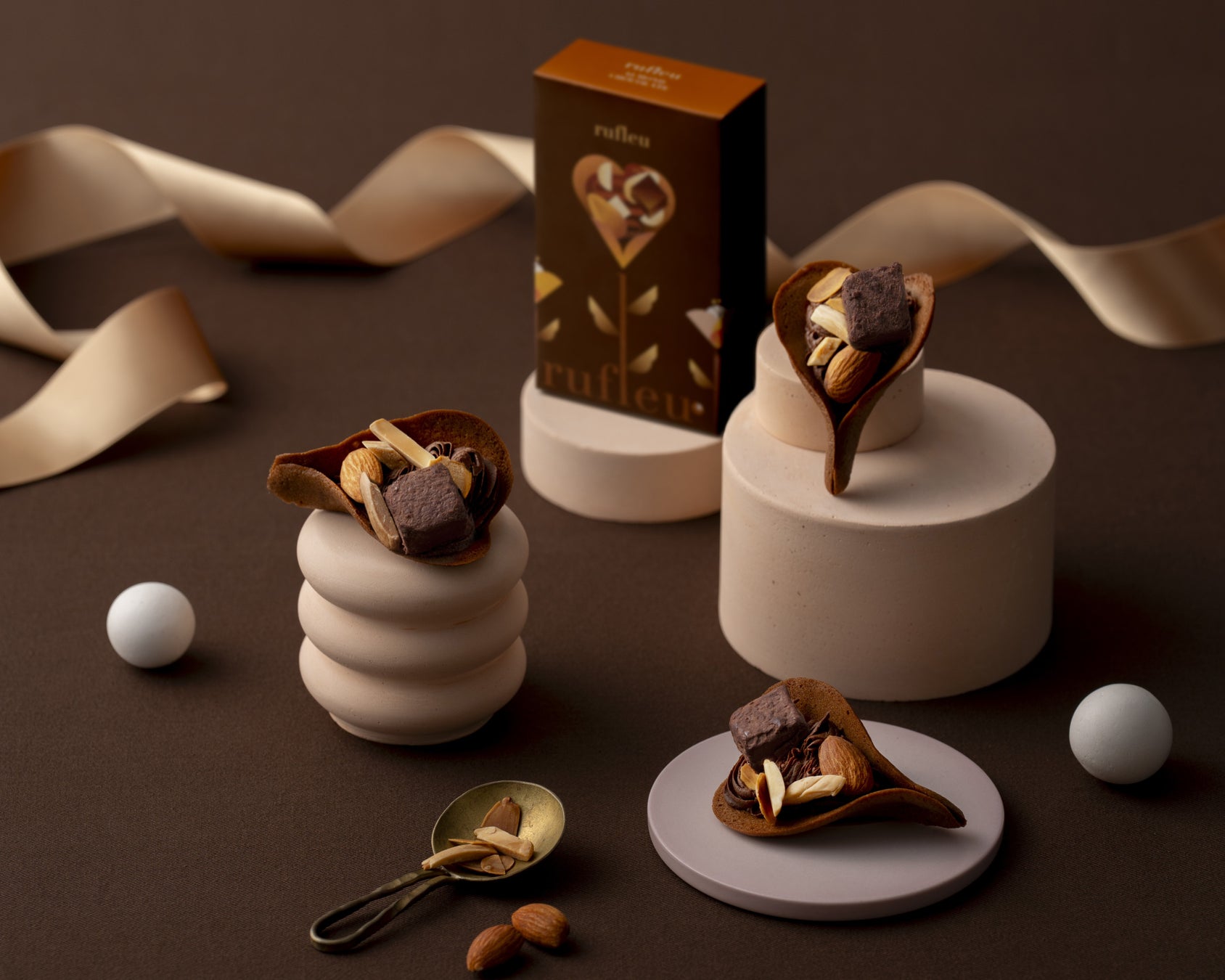 「ルフル アーモンドチョコレート」は、ココア生地のラングドシャにチョコレートクリームをたっぷりと絞り、生チョコを贅沢にひと粒トッピングしました。さらに、形の異なる3種のアーモンドをあしらい、食感にアクセントを加えた満足感のある一品です。プチギフトにも最適な、可愛らしい1個入ボックスでの販売です。