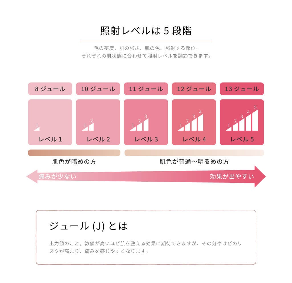 アレティの光美容器 エピピュアー(e2108WH)は肌の刺激を抑えたい方にも、できるだけ素早く処理したい方にも最適な5段階の照射レベル(8〜13ジュール)で、たっぷり使える約100万ショット。カートリッジの交換は不要です。