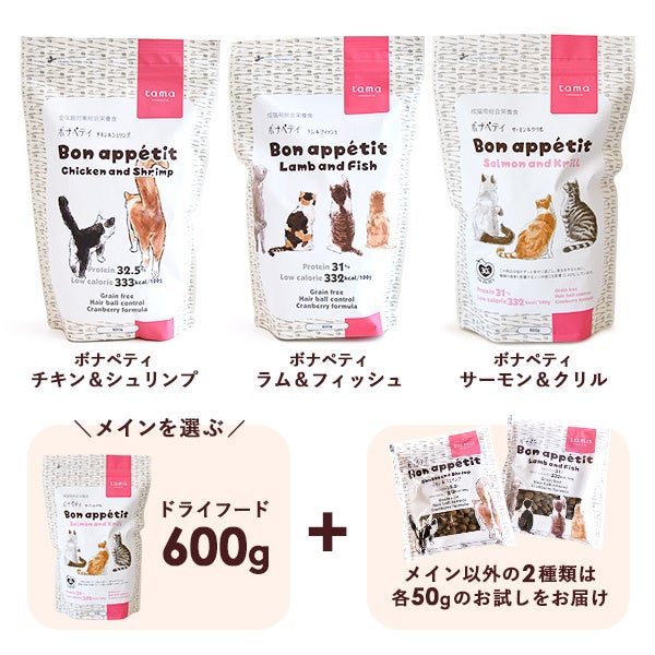 ■「tama プレミアムキャットフード(ボナペティ)初回限定お試しセット」<トライアル価格:1,870円(税込)>(数量限定、初回送料0円※)