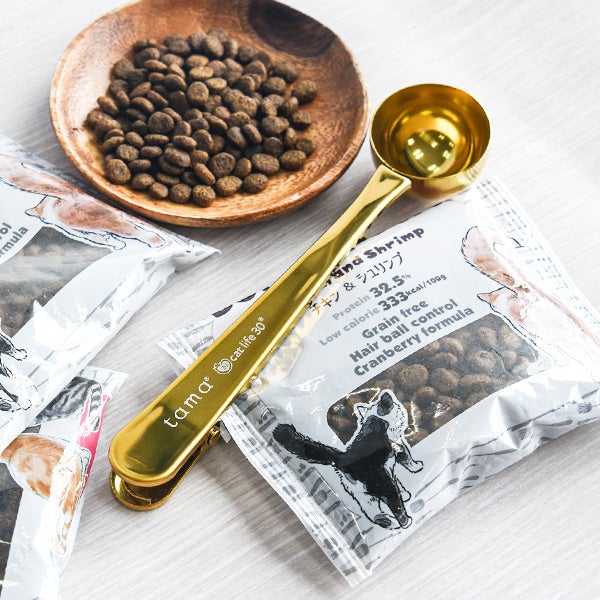 「お試しセット」ご購入者様の中から先着500名様限定で、幸せを運ぶとされる「⾦のスプーン」に便利さを加えた「金の計量スプーン」を一緒にお届けします。計量スプーンとクリップがひとつになった2WAYスプーンで、開封した袋を閉じておくのにも便利です。ステンレス製なので錆びにくく、匂いうつりしにくいのもポイントです。ひとさじ約10g相当なので、毎回の計量もスムーズに行えます。tamaのロゴと、商品開発のコンセプト「cat life 30」のロゴを刻印しました。