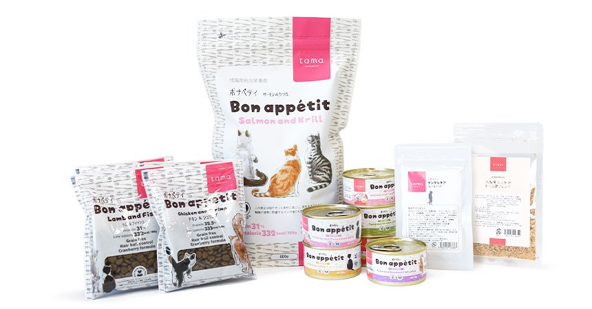 そして、2019年2月からはオリジナル総合栄養食の展開を開始。室内で暮らす猫の健康にこだわって開発したプレミアム品質の総合栄養食「tama プレミアムキャットフード(ボナペティ)」シリーズの発売を皮切りに、2023年11月からは同シリーズよりウェットフード(総合栄養食)6種を発売、同年2月には「療法食 パウダーフード 腎臓ケア」を発売しました。これからも、猫がおいしく食べてずっと健康でいられることを願い、猫のことを大切に想う人たちと共に学び、成長しながらより良いサービスと品揃えを目指して参ります。