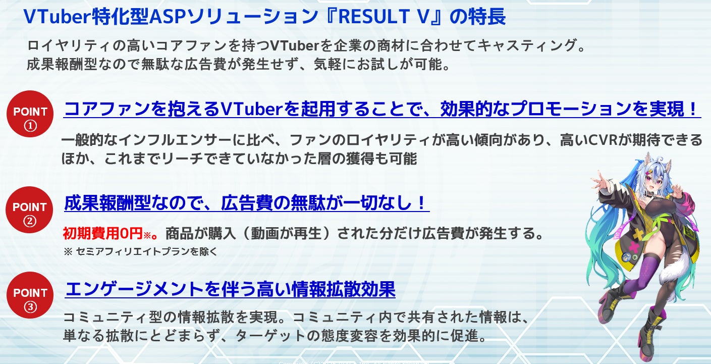 VTuberの新たなマーケティングを実現質の高いユーザーを成果報酬で獲得!VTuber特化型ASPソリューション『RESULT V』提供開始