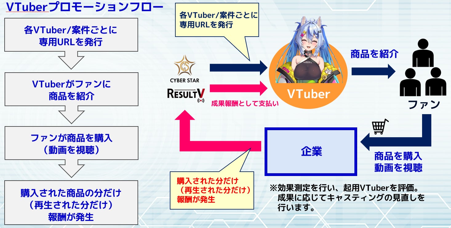 こうしたサイバースターのクリエイター支援ノウハウを活かし、VTuberの活躍の場をさらに広げることを目的として開発されたのが、『RESULT V』です。『RESULT V』は、VTuberのロイヤリティの高いファン層を活かし、その属性に合わせて企業の商材やサービスとマッチングし、成果報酬型で効率的なプロモーションを実現するASPソリューションです。